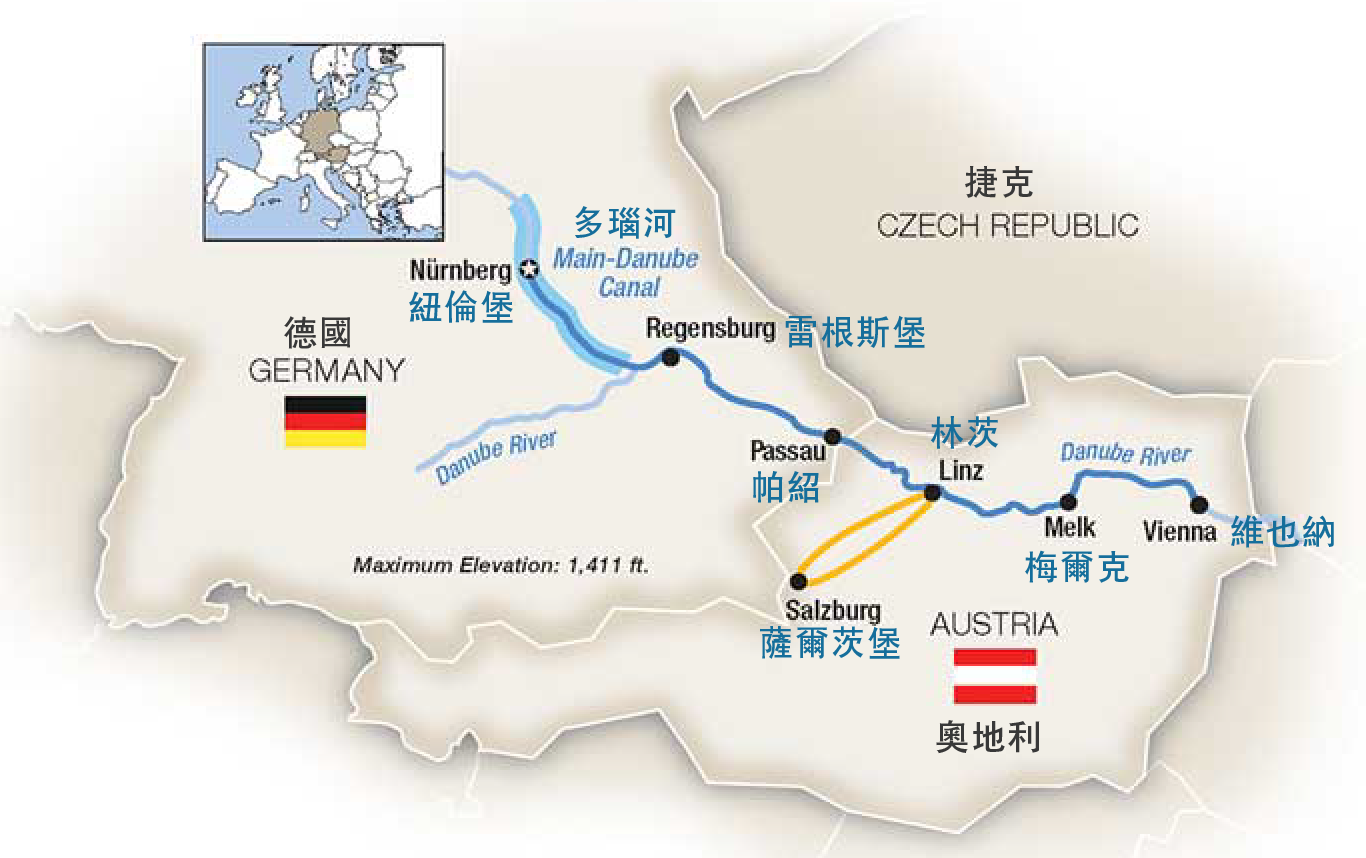▎旅遊城市:紐倫堡/ 雷根斯堡/ 帕紹/ 薩爾茲堡/ 林茲/ 梅克爾/ 維也納