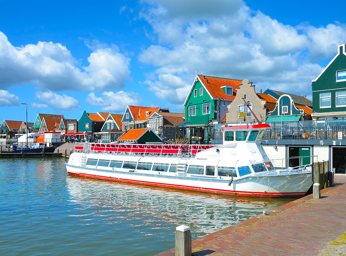 午後前往北海小漁村▲沃倫丹,村內傳統建築,古趣盎然,商店林立,彷如回到古市集,港邊更是漁帆點點,漫步其間悠然自得。或者也可坐在露天咖啡座,買杯飲料享受午後的優閒,此村亦是荷蘭人拍攝婚紗的最佳地點!
