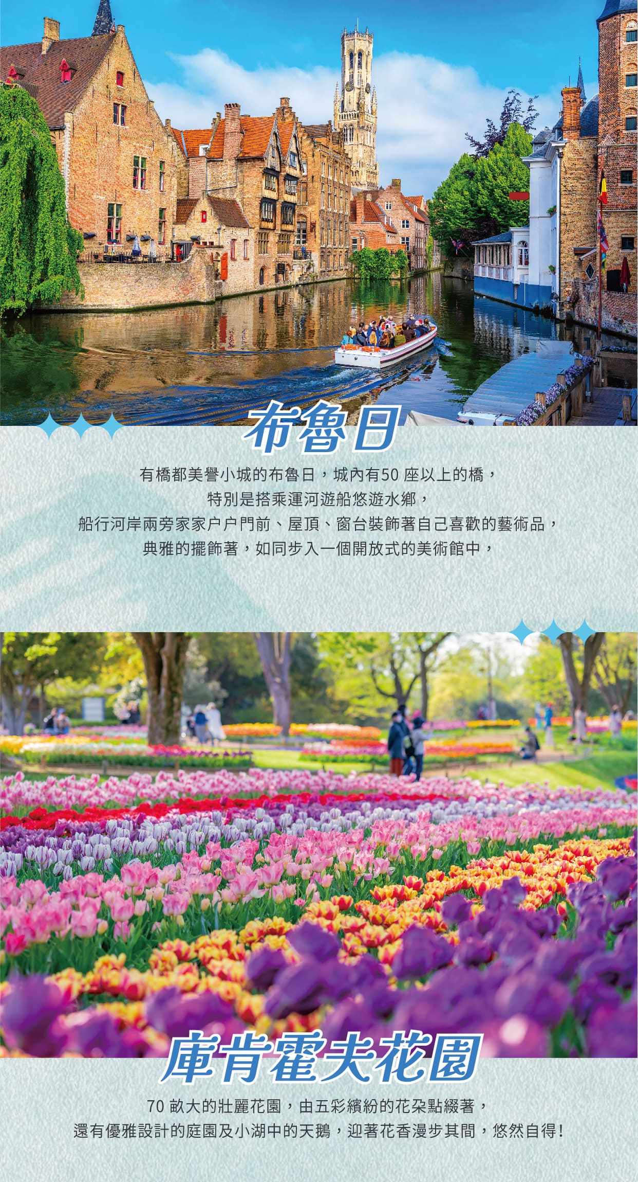 午後續往有北方的威尼斯之稱,亦是享有橋都美譽小城的布魯日,城內有50座以上的橋,特別是★搭乘運河遊船悠遊水鄉,船行河岸兩旁家家户户門前、屋頂、窗台裝飾著自己喜歡的藝術品,典雅的擺飾著,如同步入一個開放式的美術館中,古城內▲中古教堂、鐘樓、廣場中商店櫛比鱗次,更是自由活動的最佳去處。