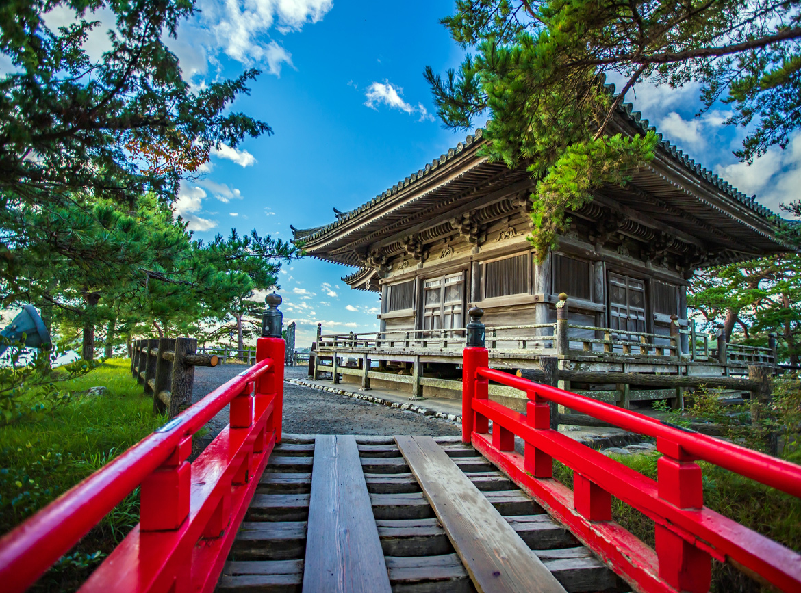 ●【五大堂】是日本三大名景松島的代表觀光點,位於近岸的一個小島上,建材全都採用櫸木,是東北地方最古老的桃山建築,古意盎然。連結小島和海岸之間紅橋,又稱為『結緣橋』,十分受到情侶們的喜愛。