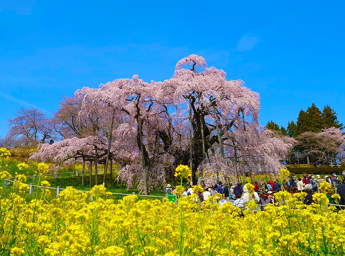 ●【三春瀧櫻】與山梨山高神代櫻、岐阜根尾谷淡墨櫻名列為日本三大櫻,它被列為國家天然紀念物,其樹齡推定有1000年以上,是日本最大枝垂櫻,樹枝東西延展約25M,高則有19M,淡紅色的櫻花順著樹枝而下,像瀑布一般因而得名。