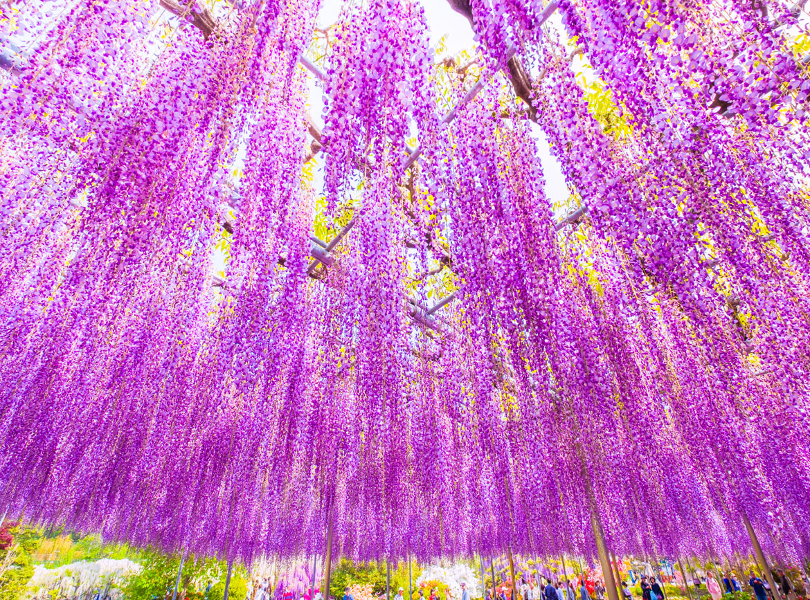 ●【栃木足利紫藤公園】最具代表的花卉,屬於多年生藤蔓植物,莖具纏繞性,直徑達10公分以上,常被用作棚架觀賞植物(花期4月中旬至5月中旬)總狀花序側生在枝端,20~30朵紫色小花整齊排列,開花時蝶形花朵成串下垂,長度可達15~30公分,花量大時彷彿紫色瀑布,美得令人屏息。公園裡的紫藤約300棵,每逢盛開時聲勢驚人,被公認是全世界最漂亮的紫藤花美景,園內最受矚目的「大藤」、「白藤通道」、「八重黑龍大藤」,甚至被列為栃木縣指定天然紀念物。「大藤」是園區的主打招牌,共有3株,樹齡已超過130年,它的藤架範圍廣達600個榻榻米,垂掛的花穗就像瀑布,非常壯觀!稀有的「八重黑龍大藤」花朵為重瓣,遠遠看每串花就像一串葡萄,而且香氣濃郁。「白藤通道」長80公尺,密生的花穗讓人感受無比柔美與幸福。