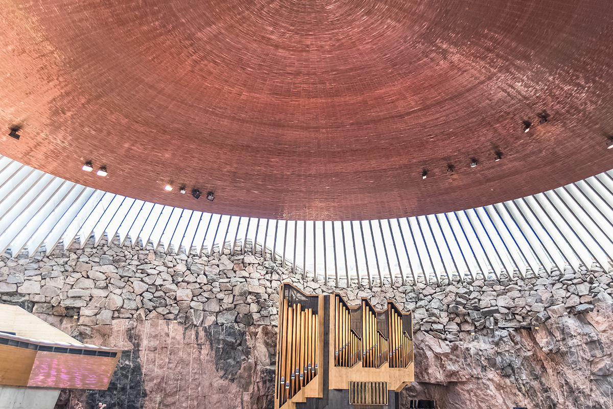 【岩石教堂】原名為登貝里奧基歐教堂,於1969年落成,原為一塊大石頭,為了保留其完整性,於是從岩石原本的形狀中挖空而成,成為赫爾辛基三大教堂之一,因為教堂蓋在巨大的岩石中,因此俗稱「岩石教堂」。