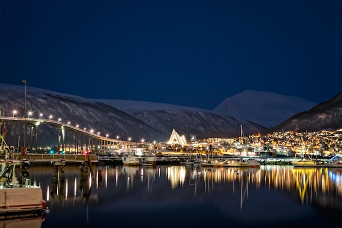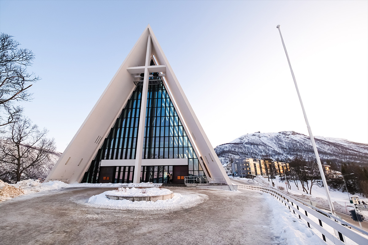 【北極大教堂】又稱特羅姆斯達倫教堂,修建於1965年。獨特的三角形造型,純潔的白色外觀,既像船屋,又像座無暇的冰山,彷若海面上漂浮的冰山。而教堂內有北歐最大的彩繪玻璃窗裝飾。北極大教堂已成為特羅姆瑟的地標。