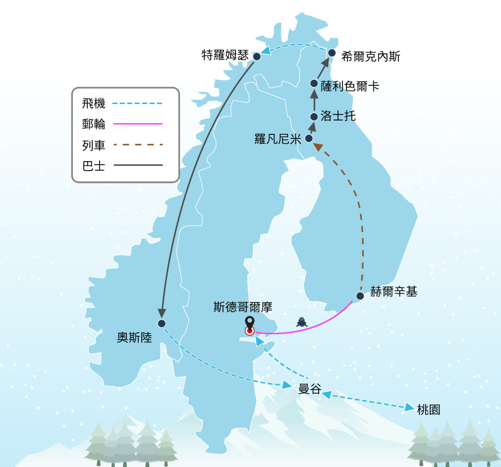 專車前往桃園機場集合,隨後搭乘豪華客機出發飛往瑞典,今晚夜宿機上。