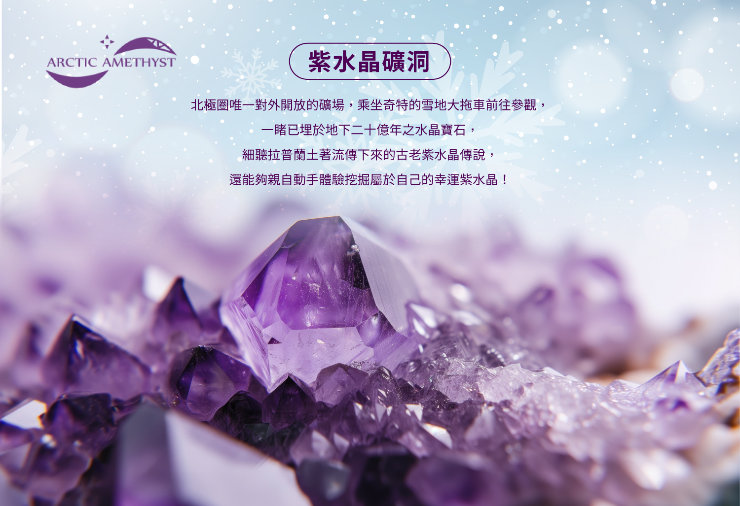 【紫水晶礦洞】北極圈唯一對外開放的礦場,乘坐奇特的雪地大拖車前往參觀,一睹已埋於地下二十億年之水晶寶石,細聽拉普蘭土著流傳下來的古老紫水晶傳說, 還能夠親自動手體驗挖掘屬於自己的幸運紫水晶。(只體驗不能帶走喔)