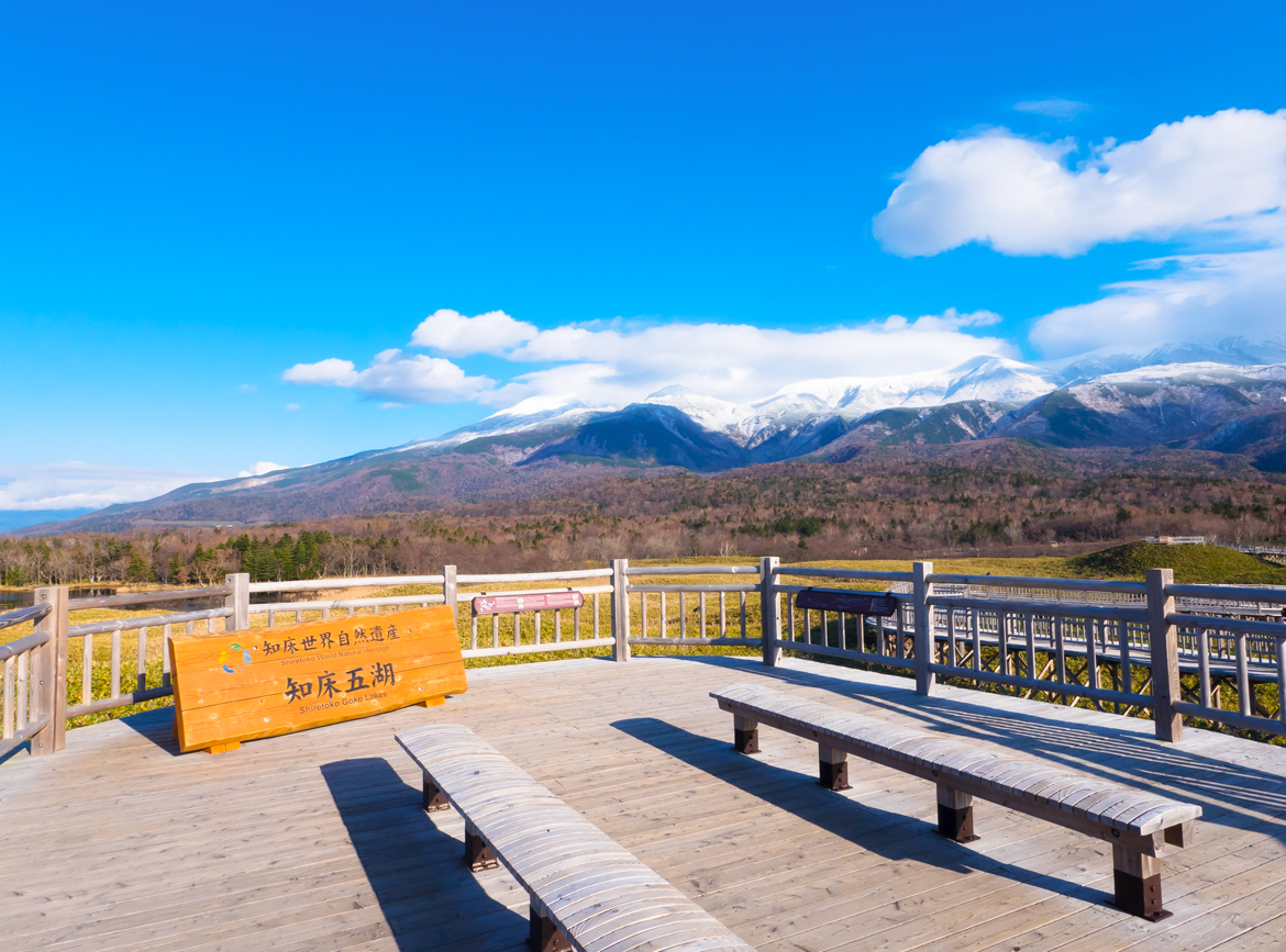 【知床五湖】知床五湖位於世界自然遺產知床半島,由五個大小不一的湖泊組成,四周被原始森林和山脈包圍。園區設有800公尺長的高架木棧道,即使熊活動頻繁時也能安全散步,從第一湖可遠望知床連山和鄂霍茨克海;還有全長3公里的地面步道需由導覽員陪同,途中可觀察熊爪痕、啄木鳥洞等野生動物痕跡。春天新綠、秋天紅葉、冬天雪景,各季節湖面如鏡映照群山,風光多變。