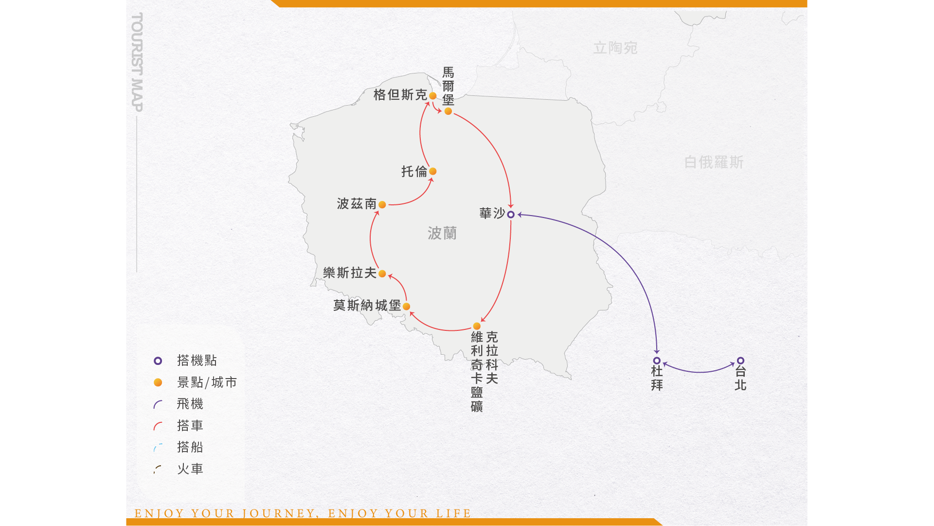 懷著浮雲遊子的浪漫心情,行囊中裝滿無限的憧憬,踏著輕快的腳步,前往機場與團體集合。由專人辦理出境手續後,搭乘隔日凌晨的豪華客機,飛往歐洲波蘭;翌日在空服員親切的問候聲中飛抵波蘭首都-華沙。