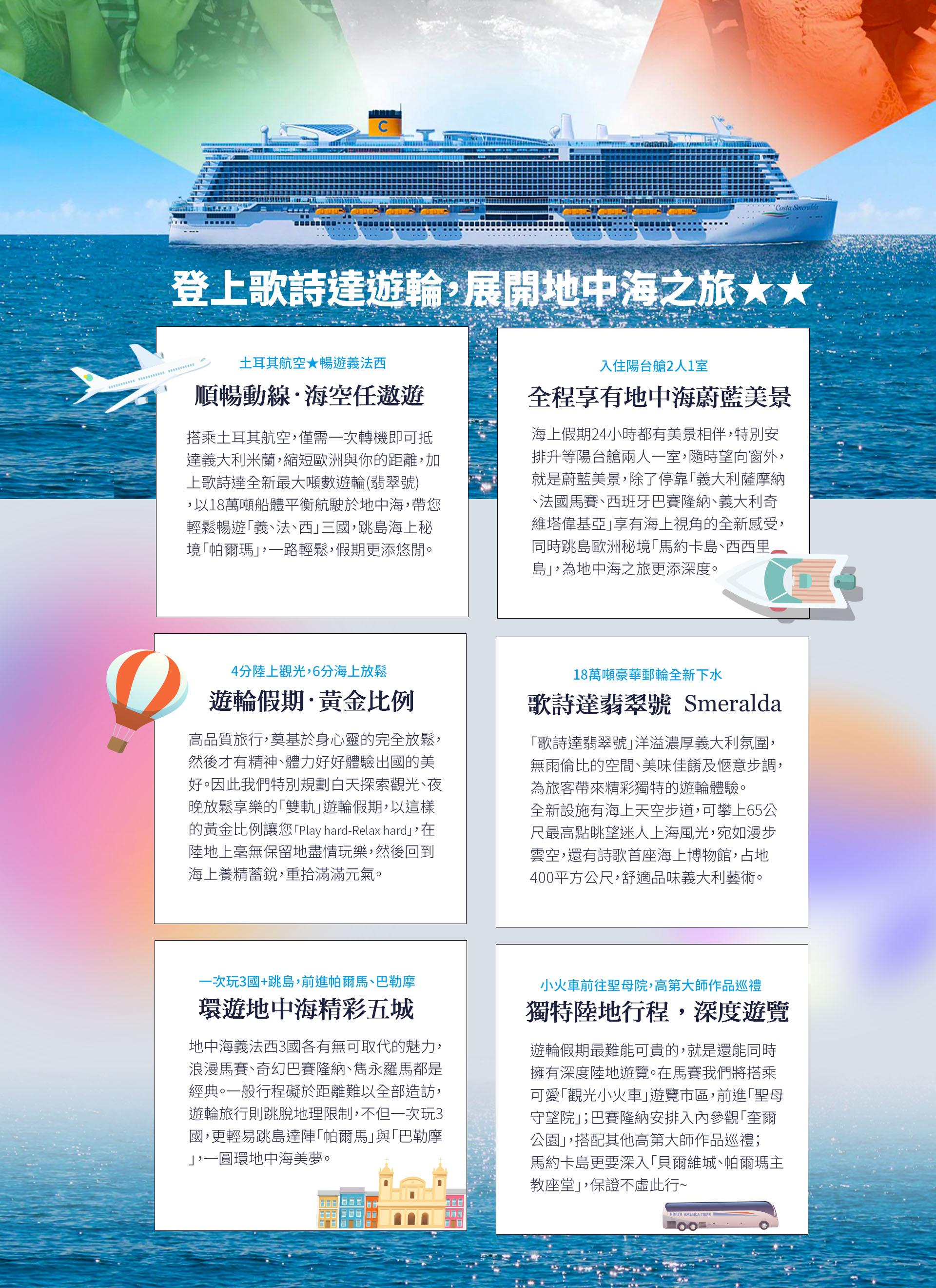 2.遊輪住宿為兩人㇐室陽台艙,單人報名或指定單人房須補單人房價差。