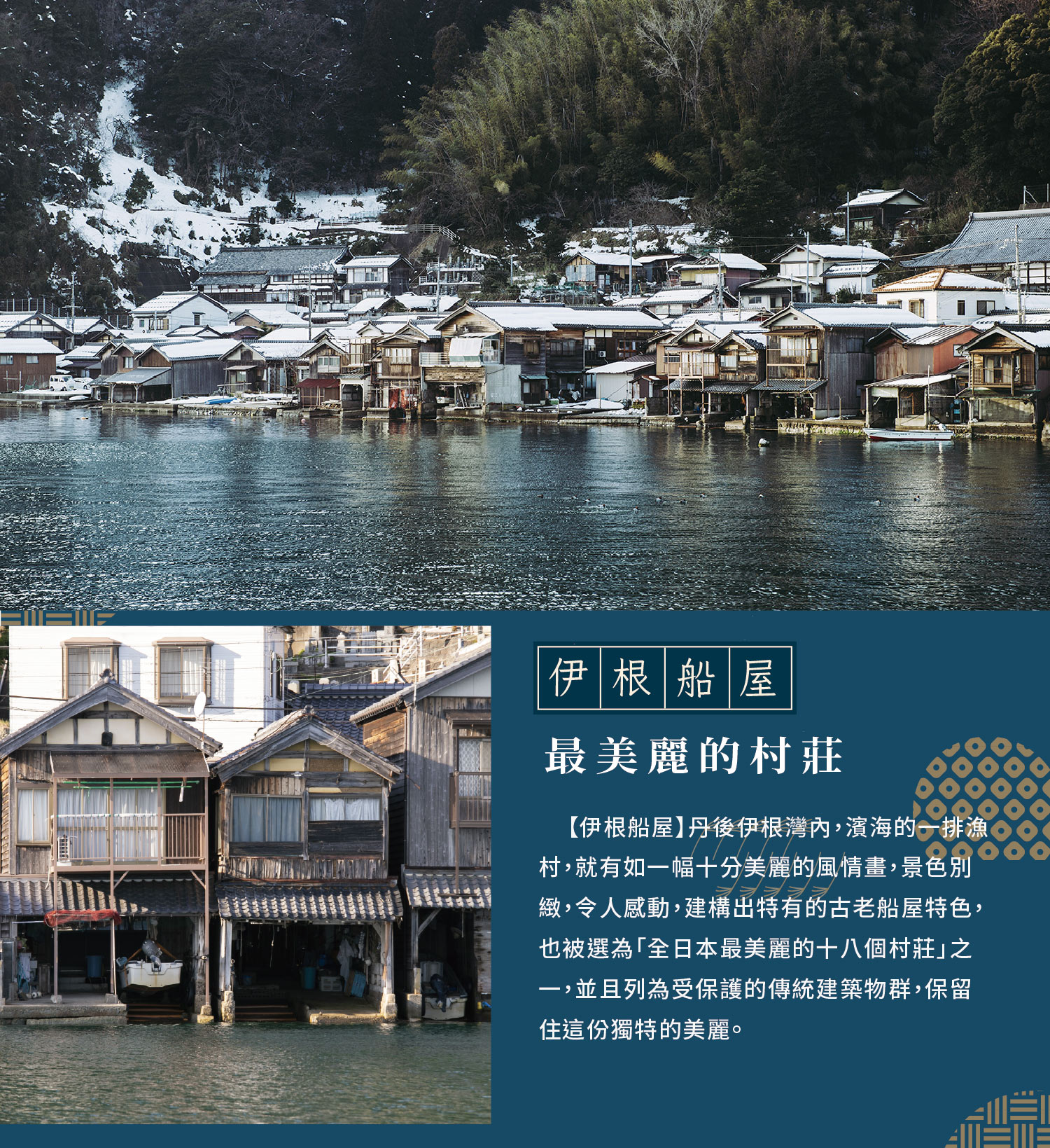【伊根船屋】丹後伊根灣內,濱海的一排漁村,就有如一幅十分美麗的風情畫,景色別緻,叫人感動,建構出特有的古老船屋特色,也被選為「全日本最美麗的十八個村莊」之一,被列為受保護的傳統建築物群,保留住這份獨特的美麗。