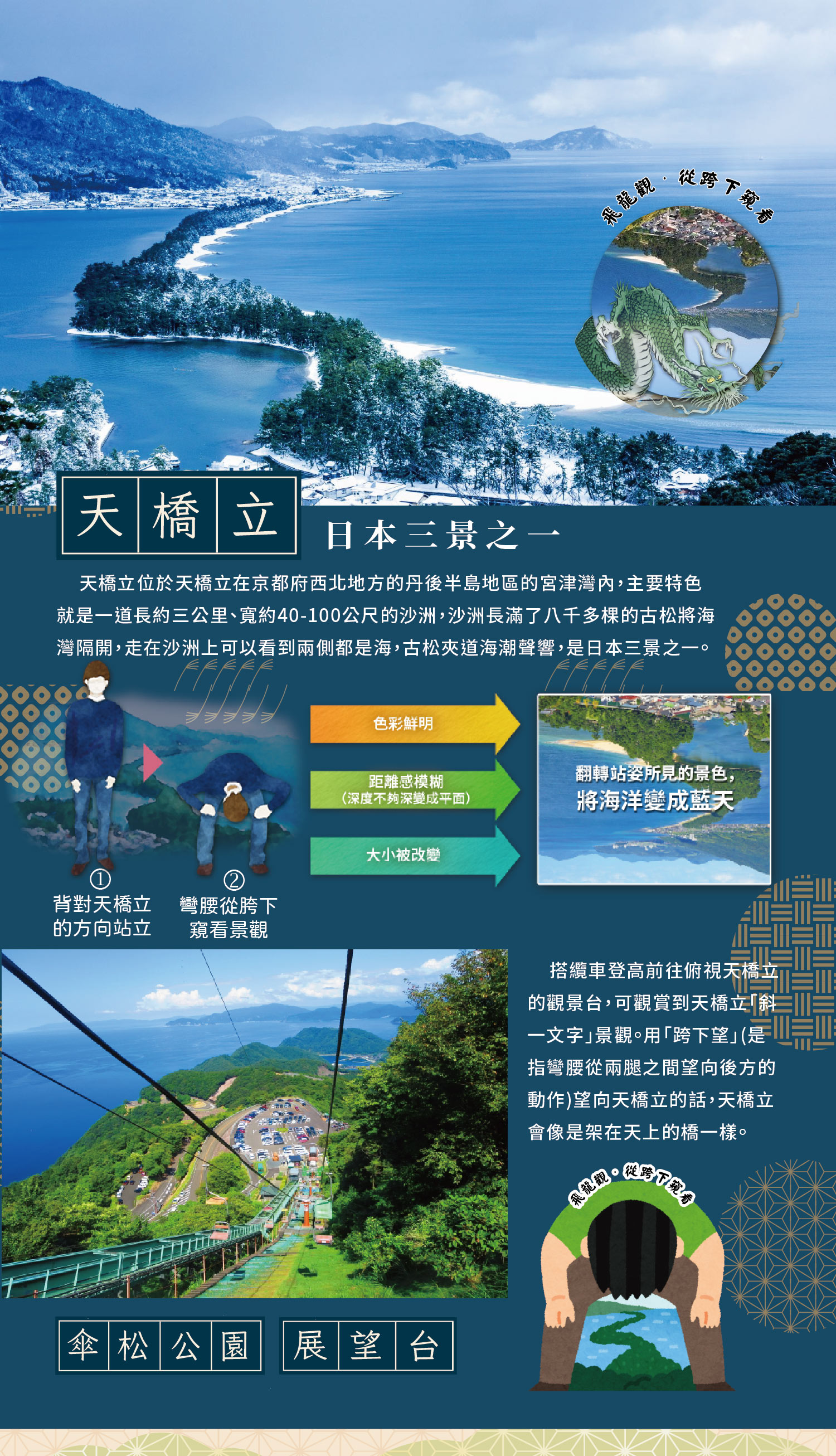 【日本三景之一、天橋立/傘松公園展望台】天橋立位於天橋立在京都府西北地方的丹後半島地區的宮津灣內,主要特色就是一道長約三公里、寬約40-100公尺的沙洲,沙洲長滿了八千多棵的古松將海灣隔開,走在沙洲上可以看到兩側都是海,古松夾道海潮聲響,是日本三景之一。