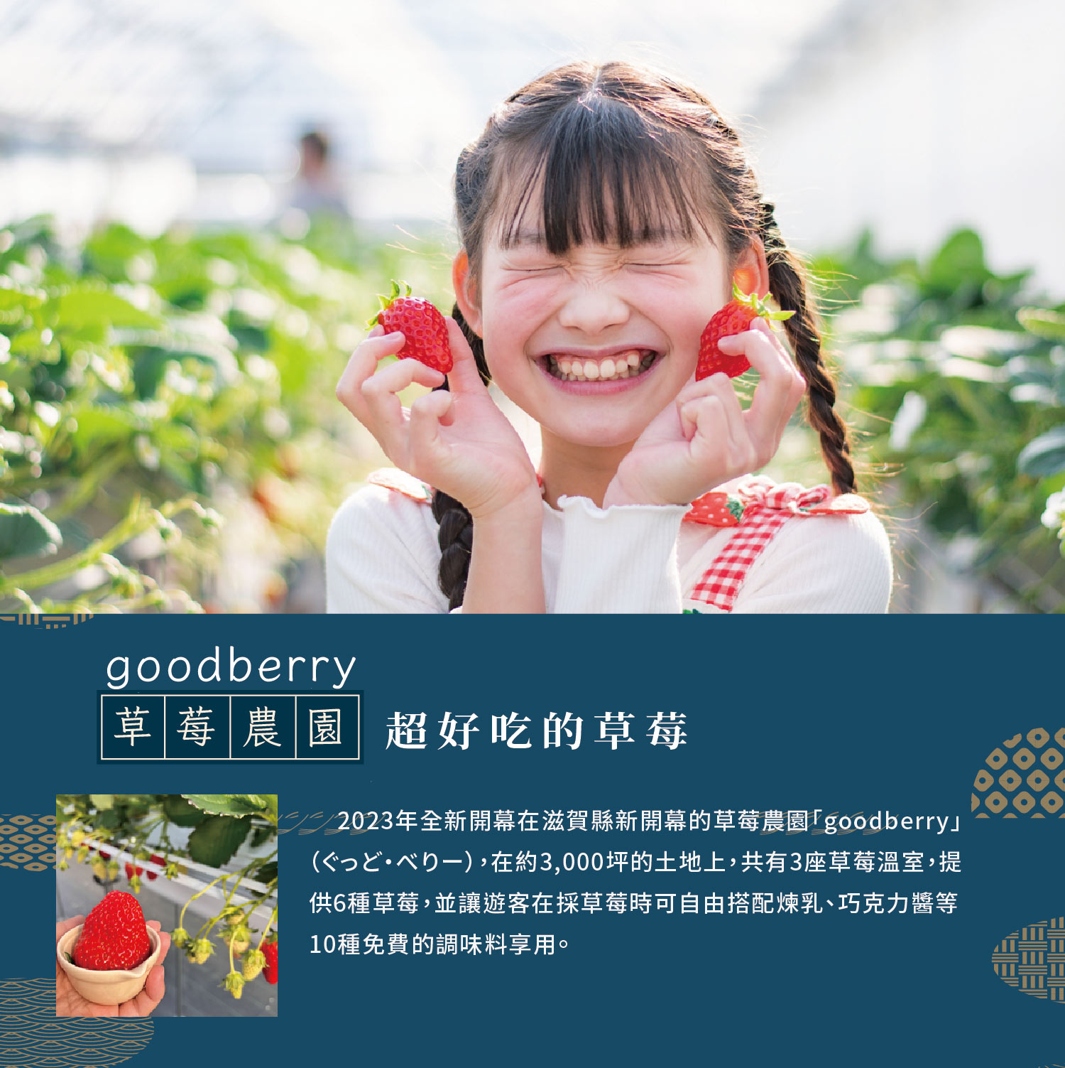 2023年全新開幕在滋賀縣新開幕的草莓農園「goodberry」(ぐっど・べりー),在約3,000坪的土地上,共有3座草莓溫室,提供6種草莓,並讓遊客在採草莓時可自由搭配煉乳、巧克力醬等10種免費的調味料享用。