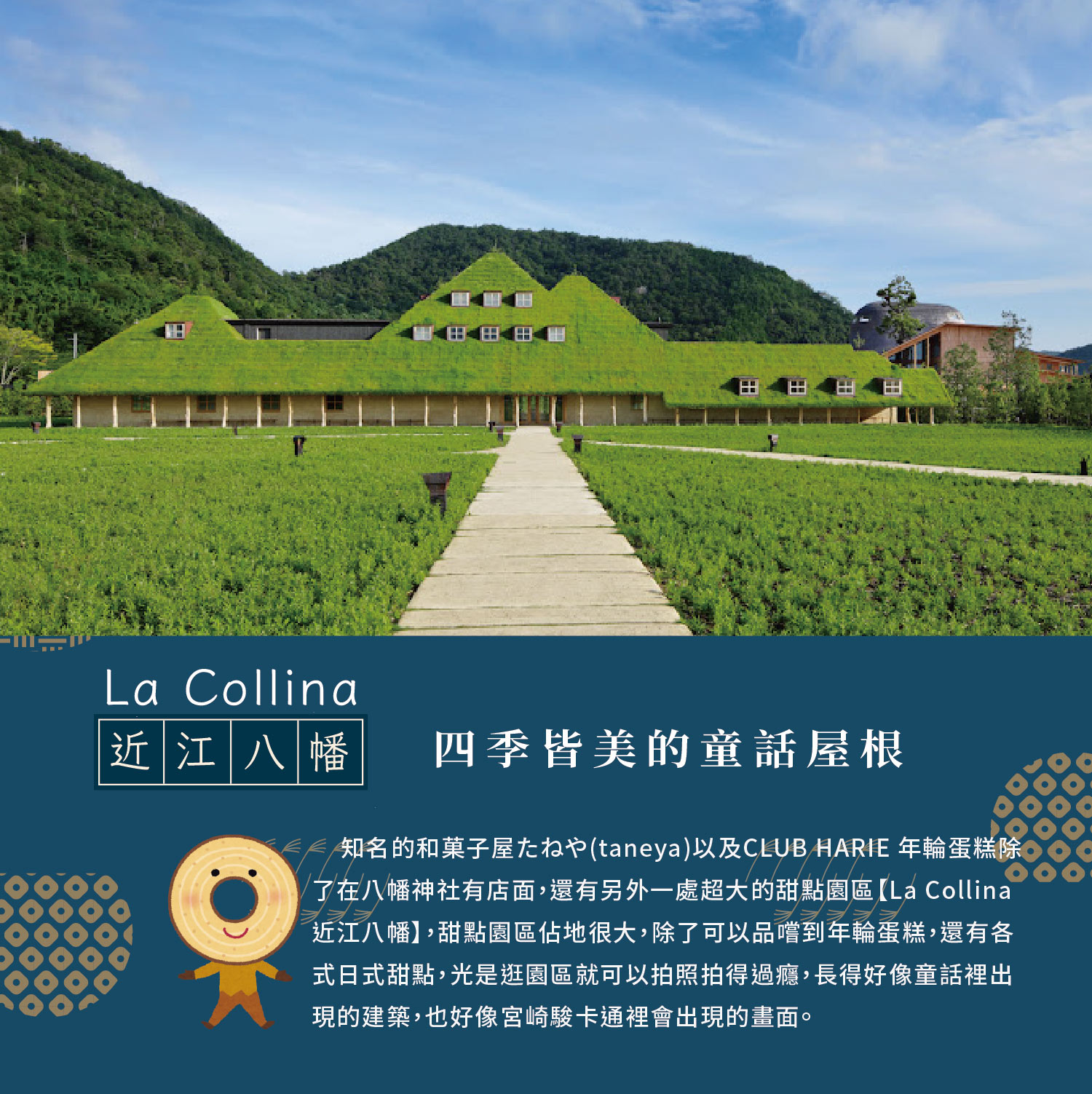 知名的和菓子屋たねや(taneya)以及CLUB HARIE 年輪蛋糕除了在八幡神社有店面,還有另外一處超大的甜點園區【La Collina 近江八幡】,甜點園區佔地很大,除了可以品嚐到年輪蛋糕,還有各式日式甜點,光是逛園區就可以拍照拍得過癮,長得好像童話裡出現的建築,也好像宮崎駿卡通裡會出現的畫面
