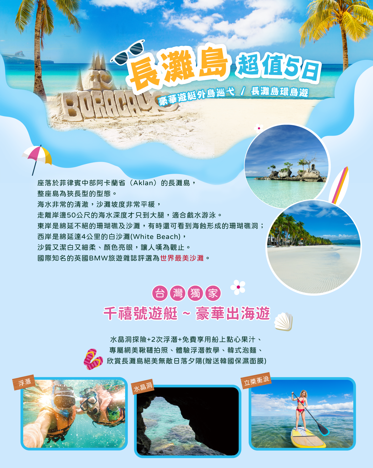 1. 出團人數:2人即可成行,台灣派遣合格領隊隨團服務,安排中文導遊(台灣人)於長灘島當地接機並提供全程旅遊服務,外站合車合團。