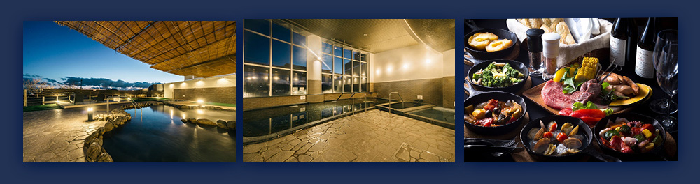取自地底1200m處的天然溫泉(源泉溫泉)pH值8.5是潤澤肌膚的「美肌溫泉」首選。設有可欣賞夜景的露天風呂、甕湯、SPA、內湯大浴場、源泉浴、寢湯、冷湯、桑拿等多元泡湯體驗,還有豪華露營首創温泉足湯-Bar,可一邊暢飲一邊欣賞美景。