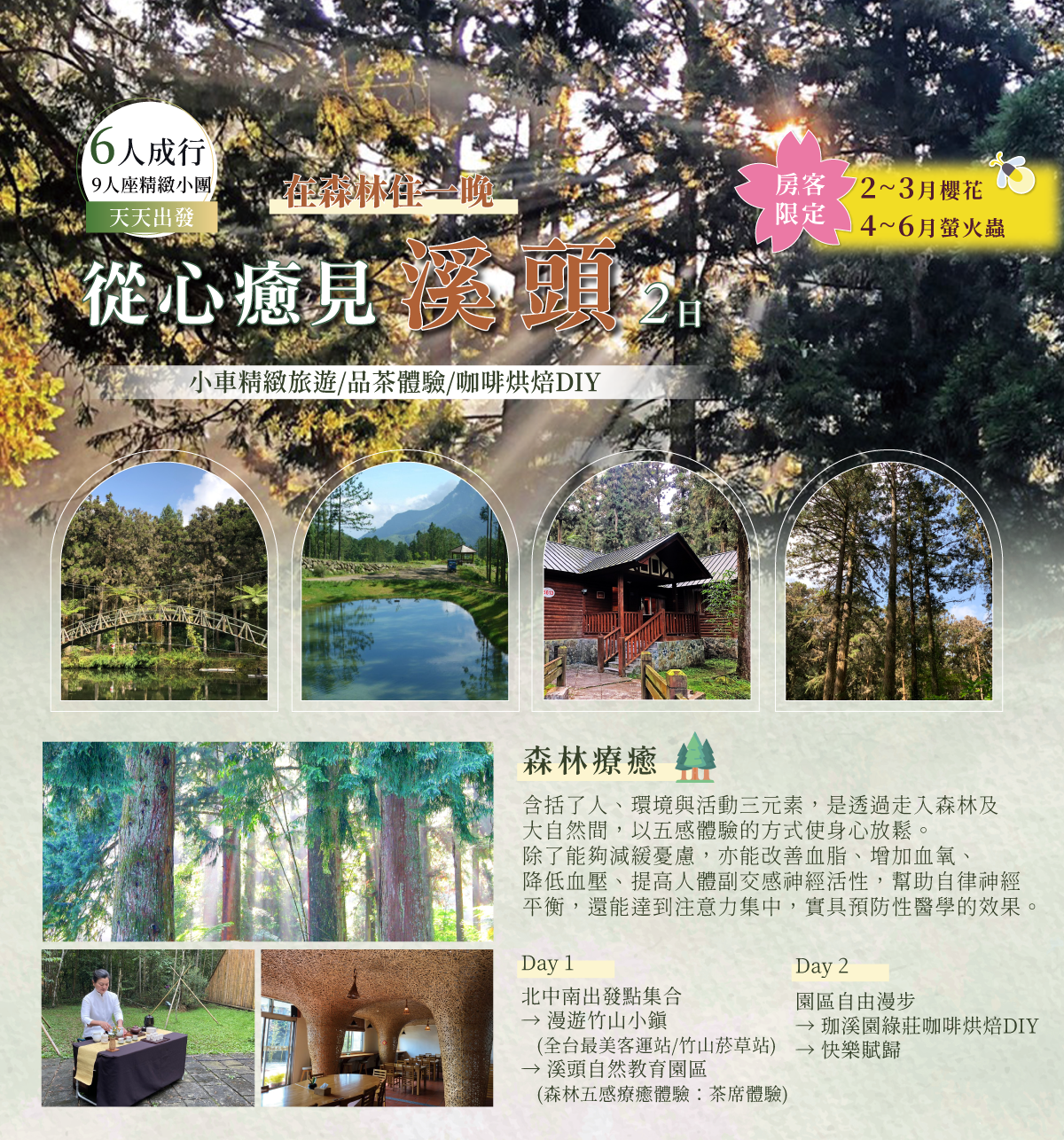 2.溪頭森林小木屋or別墅為一棟屋裡有2~3間房(房型有1大床或2小床;請同團旅客自行協調調配),附有衛浴設備,共用一個客廳。